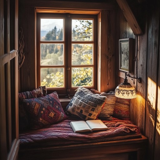 A rustic wooden reading nook built into a window alcove, layered with bohemian cushions and a warm glowing lamp — pure cozy magic.