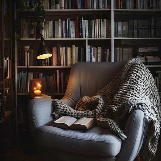 A grey armchair draped with a chunky knit blanket, an open book, a brass floor lamp, and floor-to-ceiling bookshelves — the ultimate reader’s retreat.