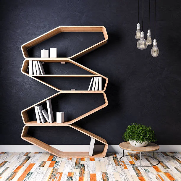 Who says a bookshelf has to be boring? Image 3 proves that your book storage can be the most visually striking element in the entire room. This sculptural zigzag shelf in warm natural wood stands against a near-black wall, creating a contrast so bold it almost looks like a painting. Edison bulb pendant lights hang in a loose cluster above, adding industrial warmth.