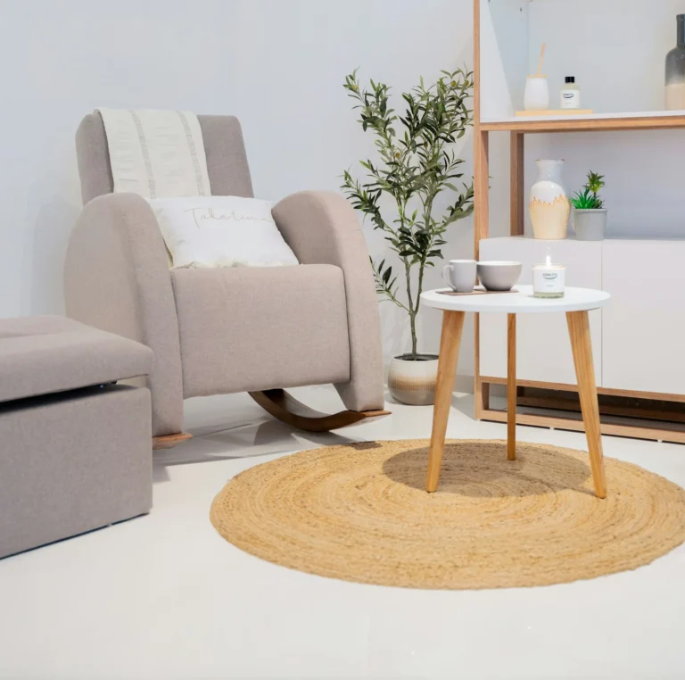 Sometimes the most powerful reading nook is the simplest one. Image 4 shows a single perfect reading chair — a soft grey rocking glider — placed on a round jute rug with nothing more than a small white side table, a mug, a candle, and a graceful olive tree plant for company.