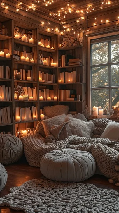 Floor-to-ceiling wooden bookshelves lined with candles and string lights, chunky knit poufs and blankets on the floor, and a large window — the reading room of dreams.