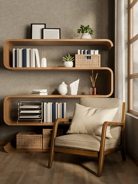 Curved floating wooden shelves styled with books, plants, and ceramics beside a cream armchair with natural light — warm, functional, and beautiful.